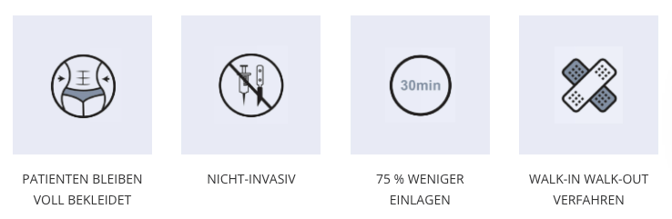InShape Chair® ist nicht mit Ausfallzeiten oder Narkoserisiken verbunden. Durch den Einsatz des innovativen Applikators sind keine Schnitte notwendig, es entstehen somit keine Narben. Die Behandlung erfordert keine bestimmte Vor- oder Nachbereitung.Die Behandlung ist sehr effektiv und effizient und dient vor allem zur Vorbeugung von Inkontinenz, bietet allerdings noch viele weitere positive Nebeneffekte.